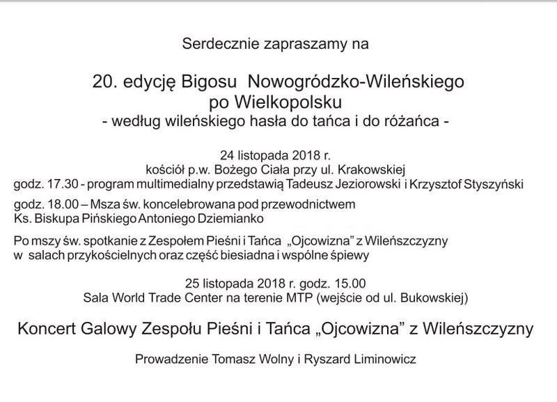 Bigos Nowogródzko-Wileński po Wielkopolsku to impreza organizowana przez Towarzystwo Miłośników Wilna i Ziemi Wileńskiej O/Poznań w CK Zamek od roku 1998, zwykle w ostatnich dniach listopada. Pierwszy "Bigos" odbył się 26 listopada 1998 roku z okazji 200-rocznicy urodzin Adama Mickiewicza. Powstał wtedy nawet wiersz, który publikujemy poniżej: