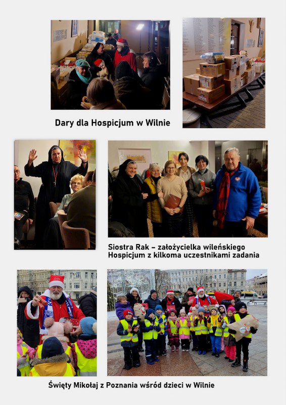 Przed Świętami Bożego Narodzenia dostarczyliśmy dary na Wileńszczyznę dla Rodaków. Odwiedziliśmy z darami szkoły z polskim językiem nauczania w Wilnie i kilku miejscowościach podwileńskich. Zawieźliśmy również paczki dla kombatantów, osób represjonowanych i ich rodzin. Paczki świąteczne przede wszystkim z artykułami pierwszej potrzeby, trwałą żywnością oraz słodyczami – 80 paczek przekazaliśmy przede wszystkim podczas spotkań z kombatantami i ich rodzinami w szkołach z polskim językiem nauczania na Litwie. W spotkaniach uczestniczyła także młodzież ucząca się w odwiedzanych szkołach.