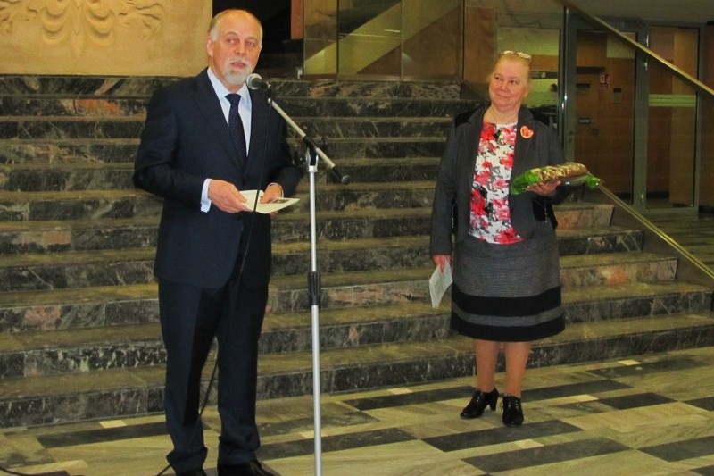 Gratulacje dla Towarzystwa z okazji 25-lecia, z rąk Tadeusza Dziuby - Posła na Sejm RP przyjmuje Krystyna Liminowicz - członek Zarządu TMWiZW